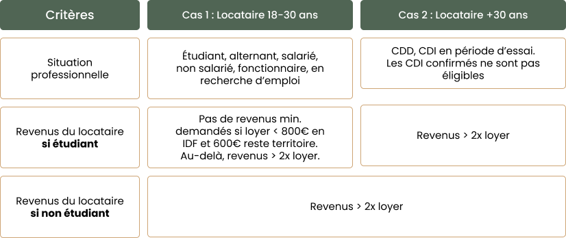 • Visale : Fournit une couverture robuste sans impact financier direct sur vos proches, mais peut avoir des critères d’éligibilité stricts.