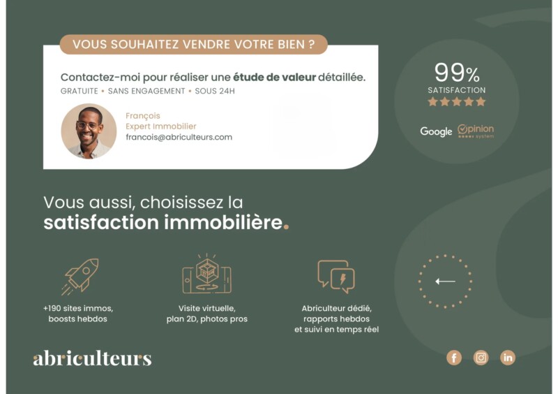 Annonce rédigée sous la responsabilité éditoriale de Mme Isabelle BRUT-FRANCIS , agent commercial (EI), immatriculé au RSAC de Nanterre sous le n° 903 553 295, sans détention de fonds, agissant pour le compte de la SARL Abriculteurs immobilier, au capital de 5 000 €, immatriculée sous le SIREN n° 837 704 584, titulaire de la carte professionnelle n° CPI 7501 2018 000 025 842 délivrée par la CCI de Paris Île-de-France, dont le représentant légal est M. Adrien Piot, ayant son siège social au 12 rue des Halles, 75001 Paris.
