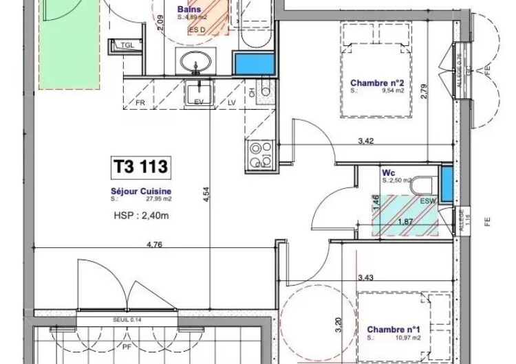 L’appartement se compose d’une belle pièce de vie de 27,95 m² avec cuisine ouverte donnant sur une loggia de 5,87 m² exposée Sud-Ouest, deux chambres de 10,97 m² et 9,54 m², une salle de bain de 4,89 m² et des WC séparés de 2,50 m².