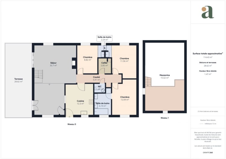 Principalement de plain-pied, elle offre une pièce de vie lumineuse de 35 m², orientée plein Sud, avec une mezzanine en surplomb, idéale pour un bureau, un coin lecture ou un espace détente. La cuisine indépendante est accompagnée d’un cellier.
