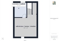 À l'étage, le palier dessert deux chambres, dont une pouvant faire office de bureau ou de chambre d'enfant. Une salle de bains avec toilettes est également présente à ce niveau.