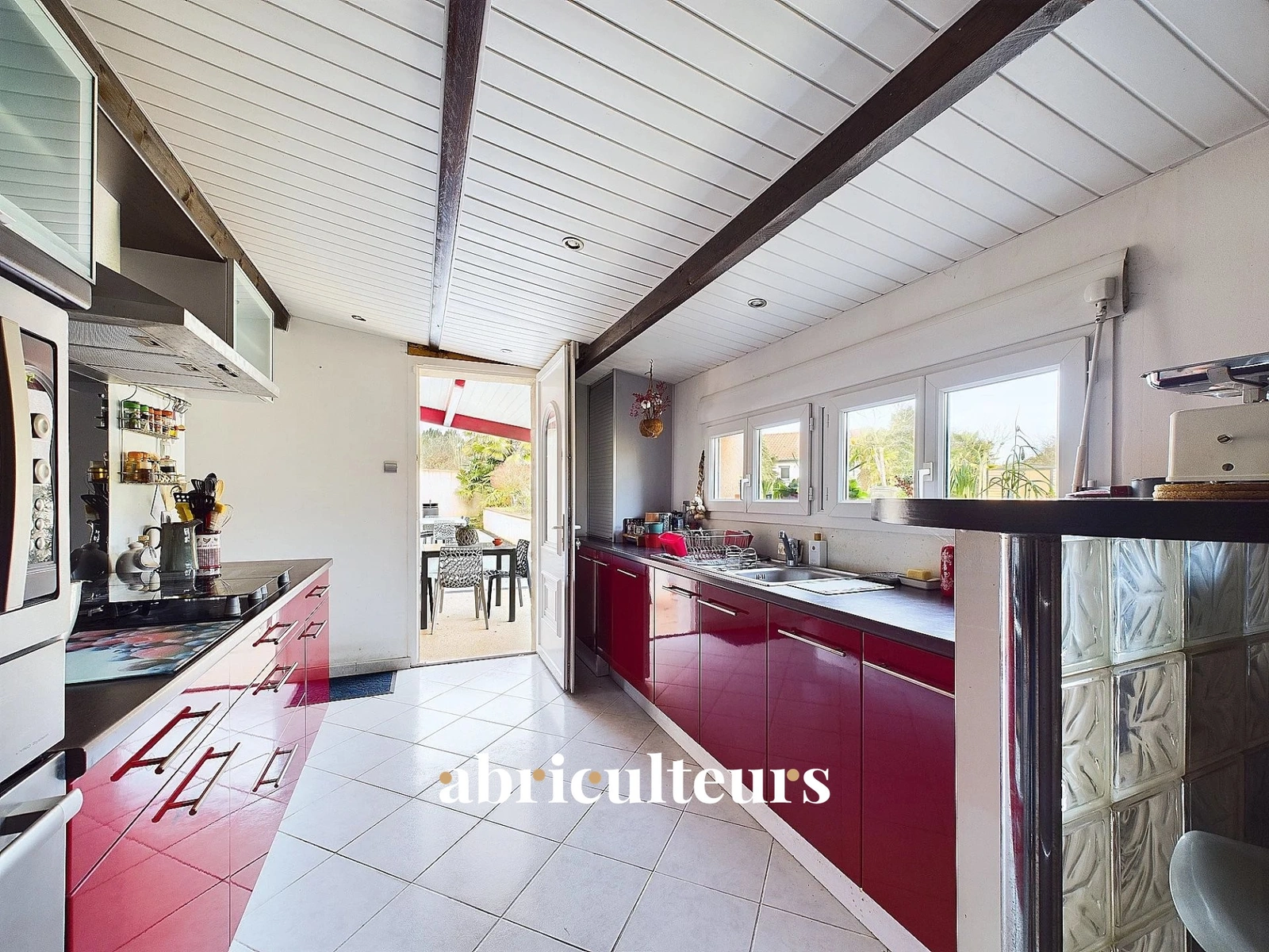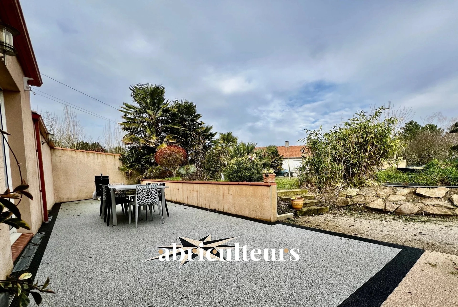 Grande terrasse avec barbecue et préau devant la cuisine .