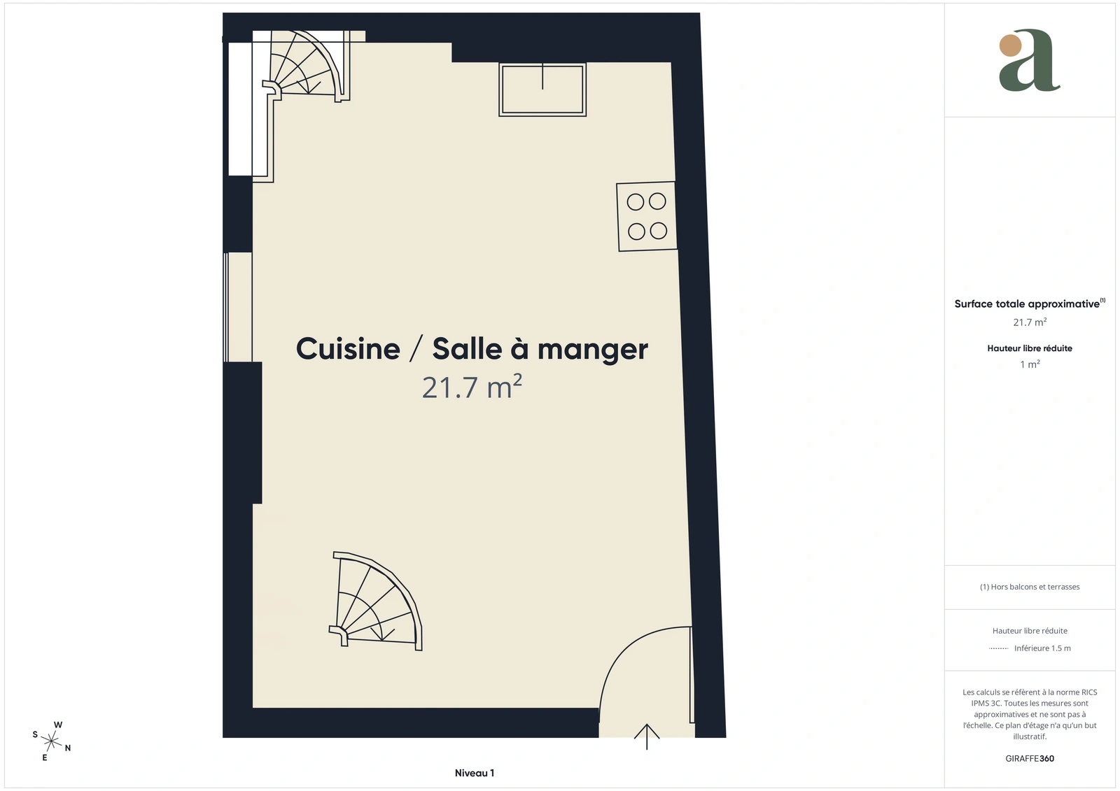L’entrée ouvre sur une agréable pièce de vie lumineuse, avec sa cuisine ouverte et son coin salle à manger. En contrebas, un salon cosy offre un espace plus intimiste, complété par un placard de rangement.